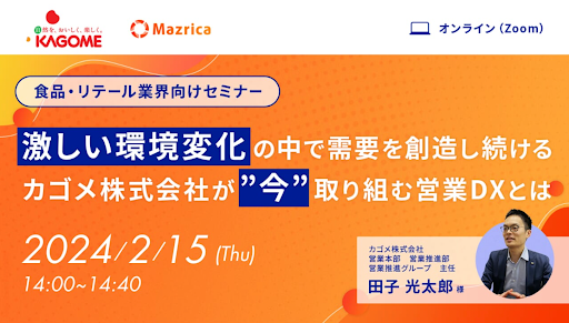 「Mazrica Sales(旧Senses)」が、「自然を、おいしく、楽しく。」をブランドステートメントに掲げる日本の食品・飲料・調味料の大手総合メーカーであるカゴメ株式会社(以下、カゴメ社)に導入されました。これに伴い食品・リテール業界向けに、 業界が ”今” 取り組むべき営業DXについてと題し、課題から導入に至った背景、理想像や展望についてご紹介するセミナーを2月15日14時〜開催いたします。