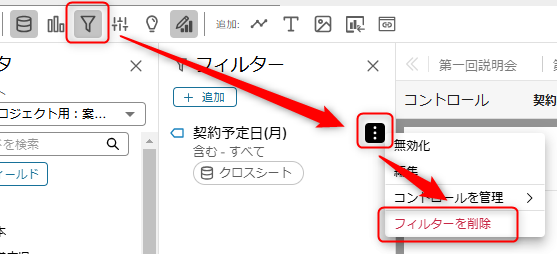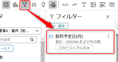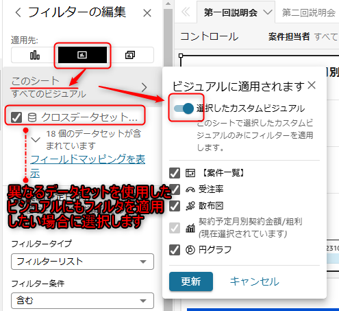 例として、データセットAを使用したビジュアルで設定した「契約予定日」のフィルタを、データセットBを使用したビジュアルにも適用したい場合、データセットBにも「契約予定日」のフィールドがある場合に限ります。データセットBに契約予定日のフィールドが無い場合、フィルタは適用されません。