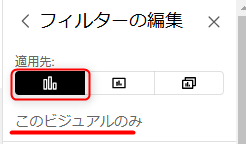 シート全体のビジュアルにフィルタを適用します。適用先を一部のビジュアルのみに指定する場合、【このシート】を選択し、【選択したカスタムビジュアル】をONにすることで指定できます。