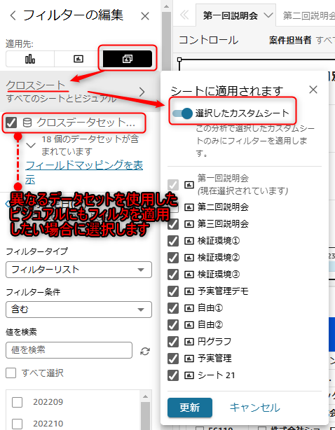 但し、同一シート内に異なるデータセットを使用したビジュアルにはフィルタが自動適用されません。適用したい場合、【クロスデータセット】にチェックを入れると、自動的に他データセットと連動してフィルタが適用されます。但し、データセット間に同一フィールドがある場合に限ります。