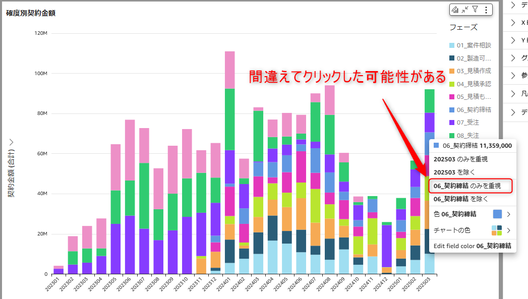 ⑥フェーズ別契約金額の棒グラフを作成し、特定のフェーズの案件情報のみの表示になってしまった場合、どのような原因が考えられますか?