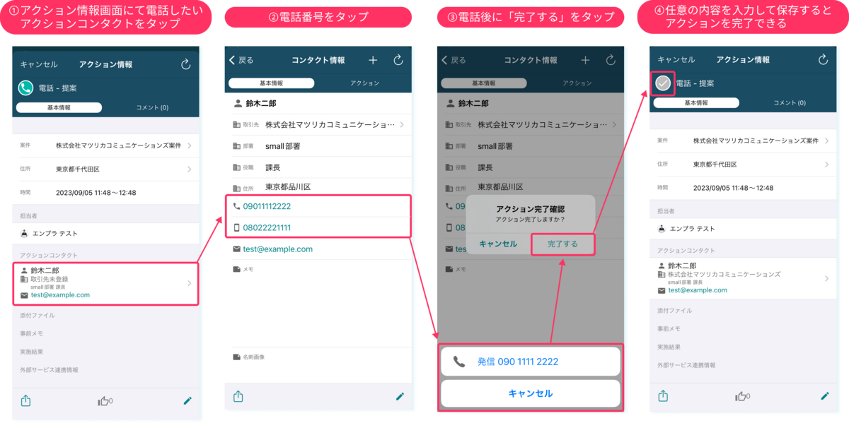 2.電話番号をタップして電話をかけ、モーダルで『完了する』をタップ