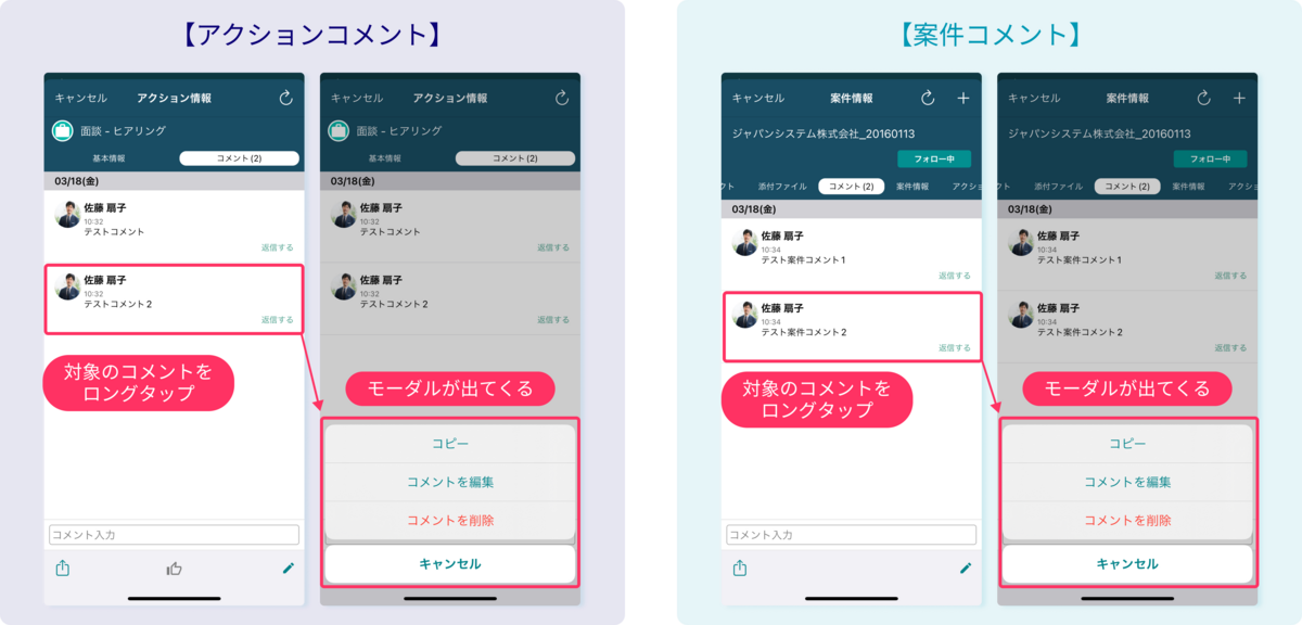「アクションコメント」や「案件コメント」画面で自分のコメントをロングタップすると『コピー』、『編集』、『削除』ができます。