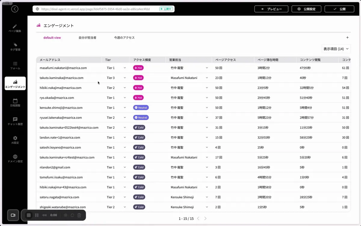 営業メール自動作成エージェント「Fumi」は、DealAgentが収集した見込み顧客のコンテンツ閲覧履歴やAIとの対話データを分析し、各顧客の興味・関心に合わせた営業メールを自動で作成する機能です。従来の画一的なメール配信とは異なり、顧客一人ひとりの状況に応じ、高度にパーソナライズされたコミュニケーションを実現します。