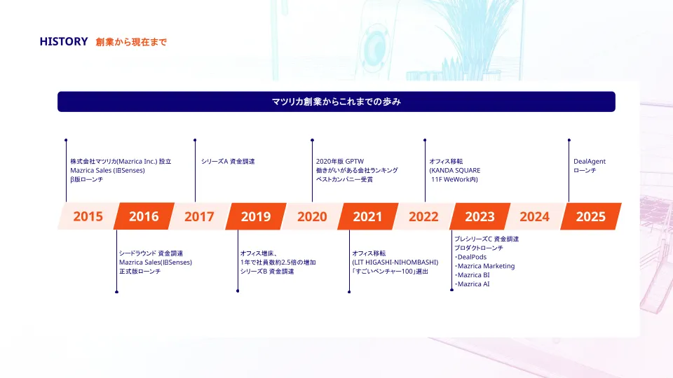 その後も、単なる営業支援を超えて、マーケティングから組織全体の強化に至るまでを包括的に支援する、次世代型営業DXプラットフォーム「Mazrica」へと進化を遂げました。SFA/CRM、MA、BI、そしてAIまでを一気通貫で提供し、営業活動の質と生産性の両面から企業の成長を支えています。