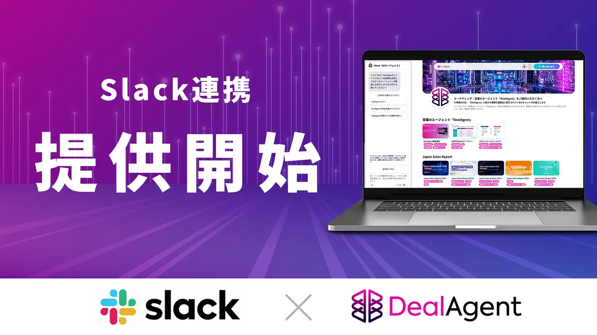 マーケティングAIエージェント「DealAgent(ディールエージェント)」は、コミュニケーションツールSlackとの機能連携を開始したことをお知らせいたします。