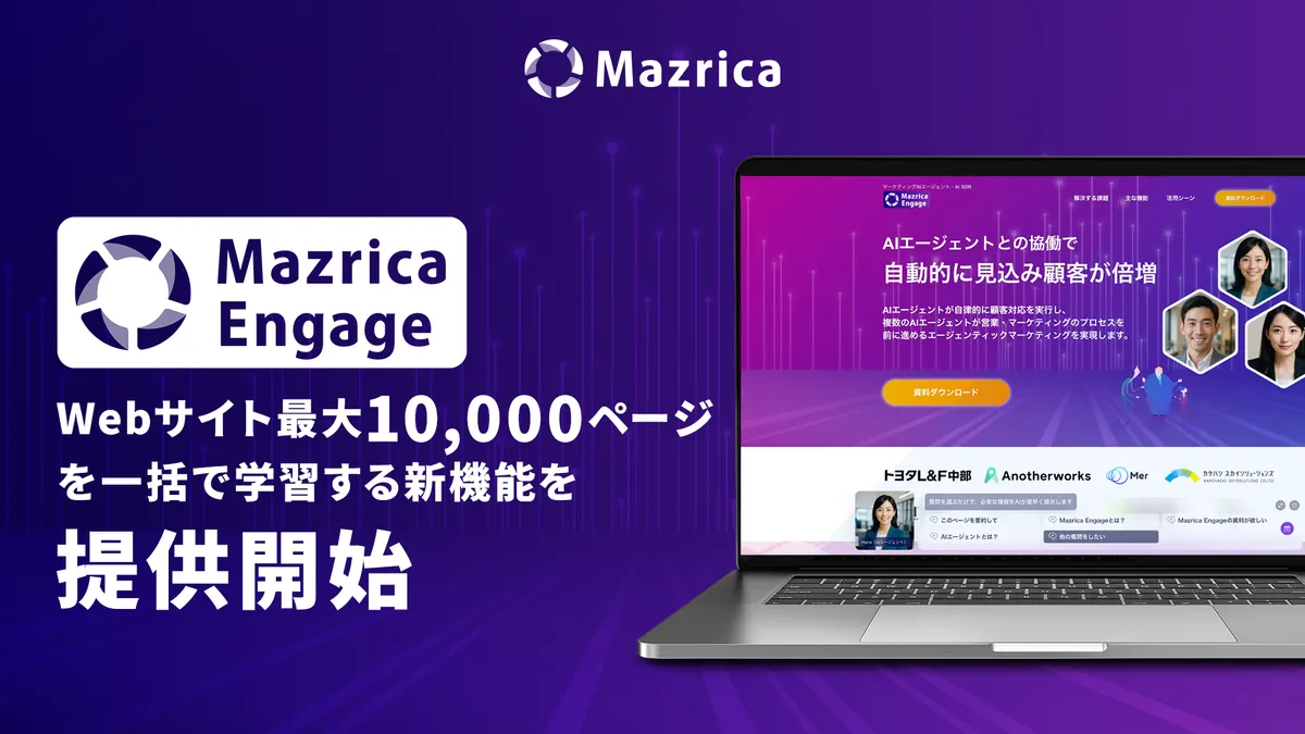 株式会社マツリカ(本社:東京都中央区、代表取締役CEO:黒佐英司、以下「当社」)が提供するマーケティングAIエージェント「Mazrica Engage(マツリカエンゲージ)」は、指定したWebサイト配下の最大10,000ページを一括でAIに学習させることができる機能を提供開始いたしました。 本機能は、トップページのURLを入力するだけで、最大5階層・最大10,000ページまでを自動巡回・取得し、AIに学習させるものです。複雑な階層構造を持つ企業Webサイトにも対応し、導入時の設定工数を大幅に削減します。