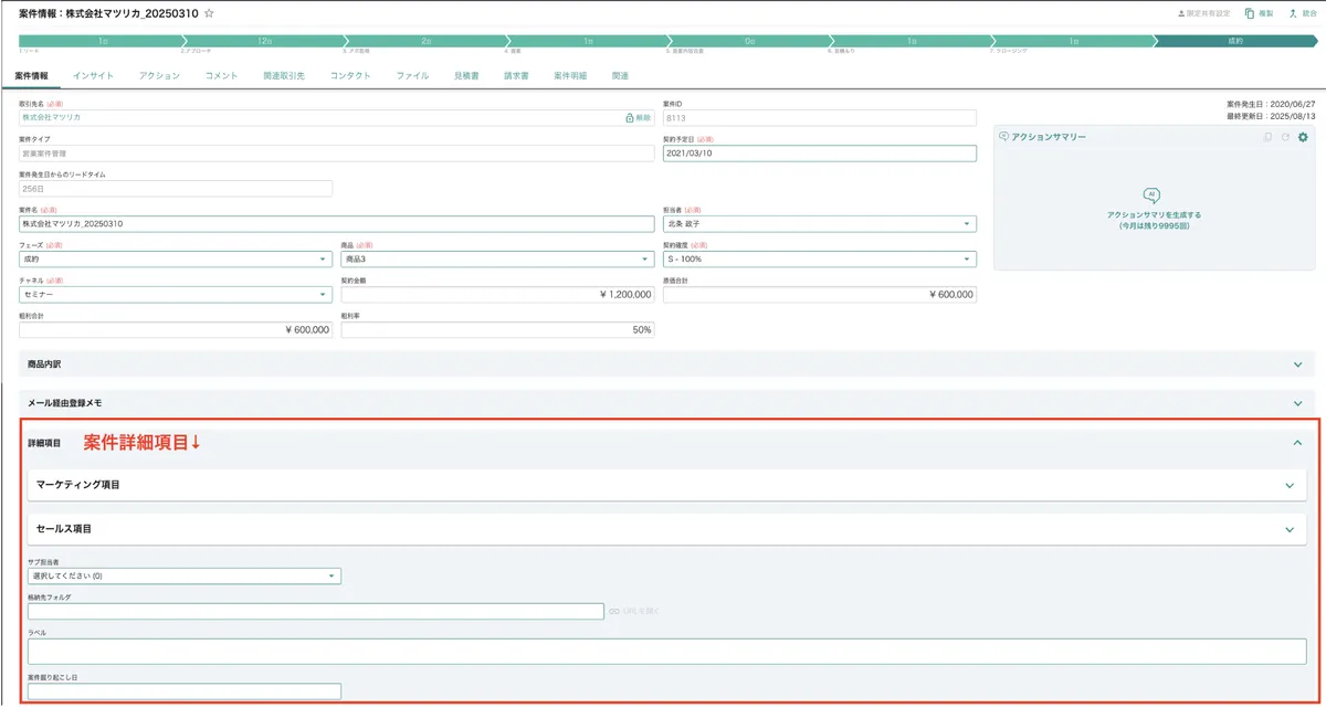 案件における詳細項目(自社独自の管理項目)を設定することができます