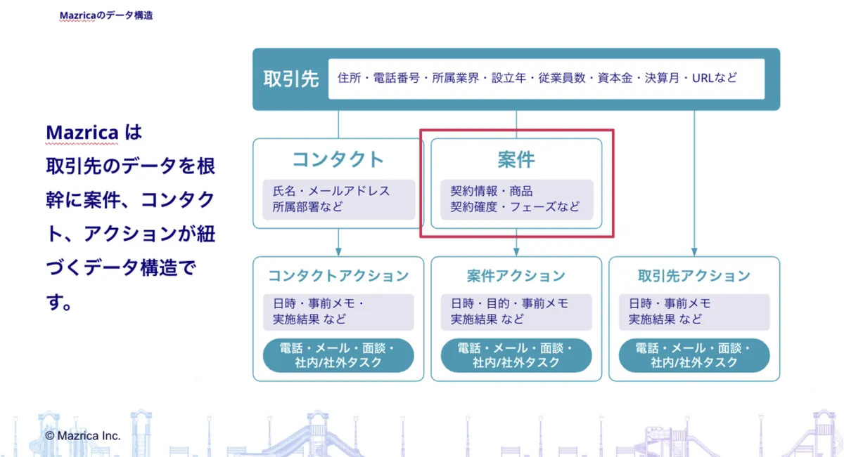 ⚫︎Mazricaの基本項目は、項目名の変更や削除、並び替えは仕様上できません(取引先名、案件タイプ(Growthプラン契約者のみ)、契約予定日、案件名、担当者、フェーズ、商品、契約確度、チャネル、契約金額)