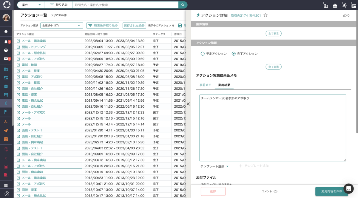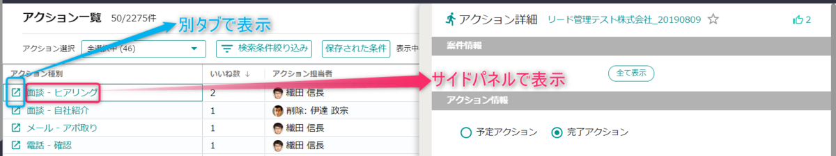※アクション一覧>事前メモ/実施結果の全表示/直接編集の機能はなくなりました。サイドパネルでのご確認および編集をお願いします。