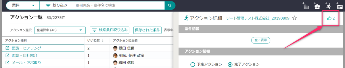 サイドパネルで表示したアクションの右上から「いいね」ができるようになりました。