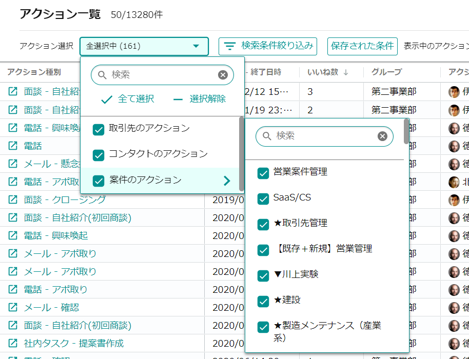 取引先アクション・コンタクトアクション・案件アクションといったひもづけ先が異なるアクションをすべて画面上で同時に確認できるようになりました。