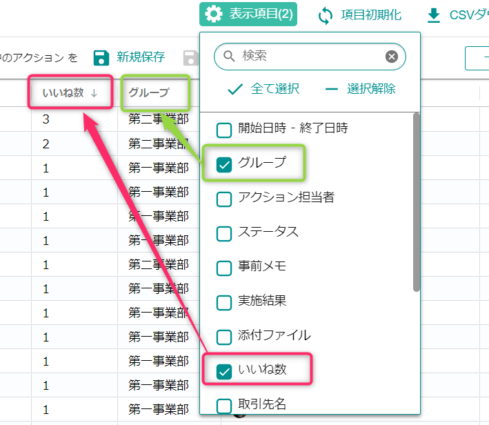 <追加表示可能項目>いいね数、アクション主担当者のグループ