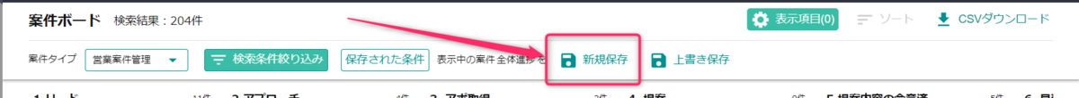 画面中央上部「新規保存」ボタンから表示条件を保存しておくと、いつでも自分の担当案件のみをすぐに表示できます。