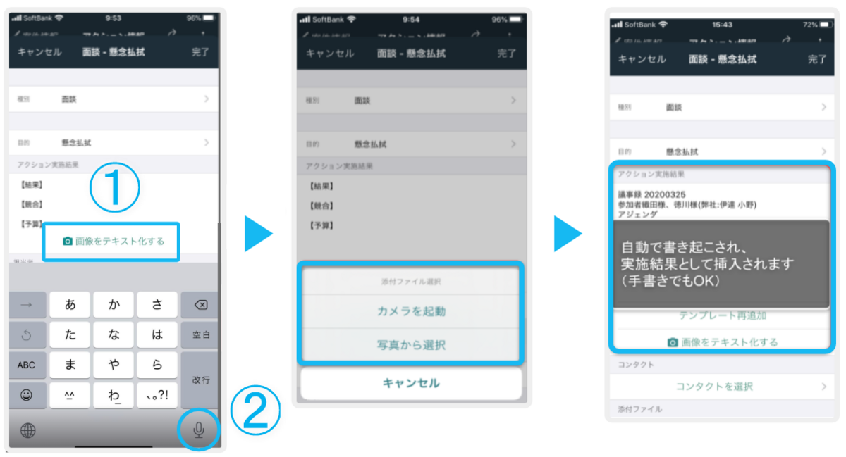 モバイルアプリをご利用いただくことで、手書きの文字の内容や音声入力結果をアクションの実施結果に反映させることができます。