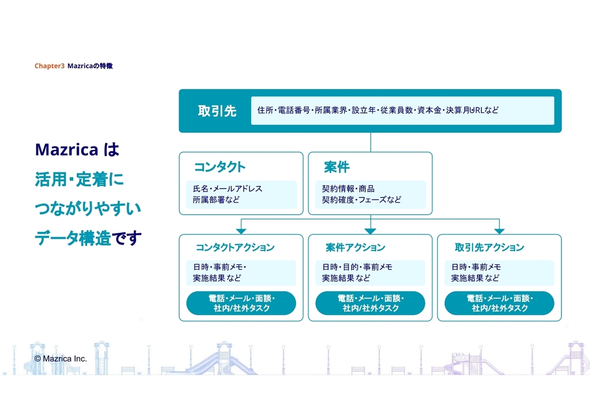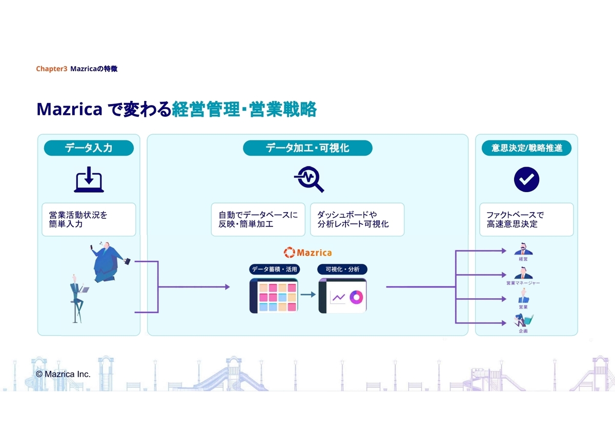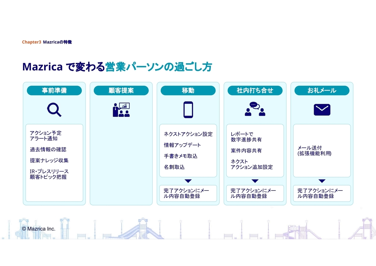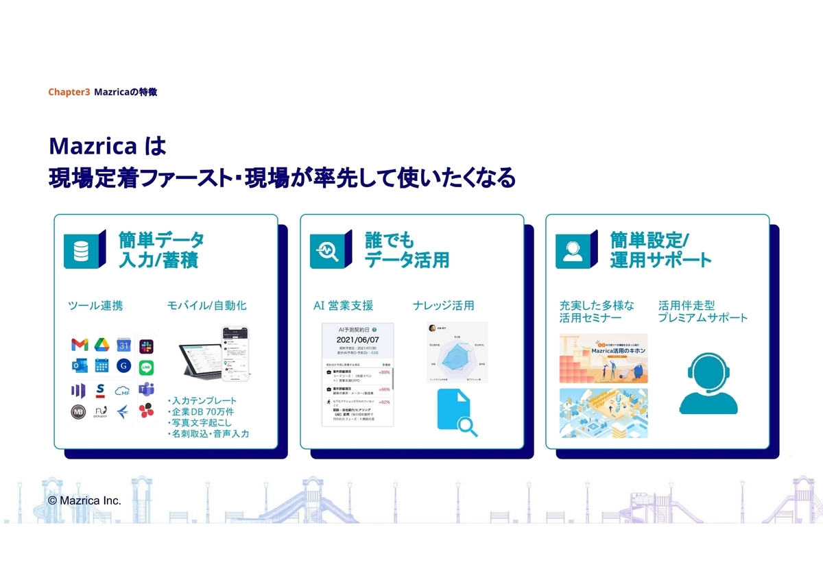 Mazricaを具体的にどう利用していけばよいのか「営業パーソンの過ごし方」「マーケティングアプローチ」「経営管理・営業戦略」それぞれの立場におけるシーン別の操作方法をご案内しています。Mazricaを使うことでなにが可能になり実務がどう変わるのか、こちらの第3編「Mazricaの特徴」をご覧ください。
