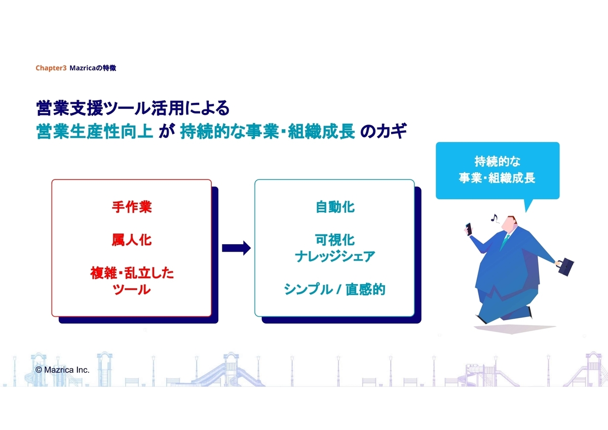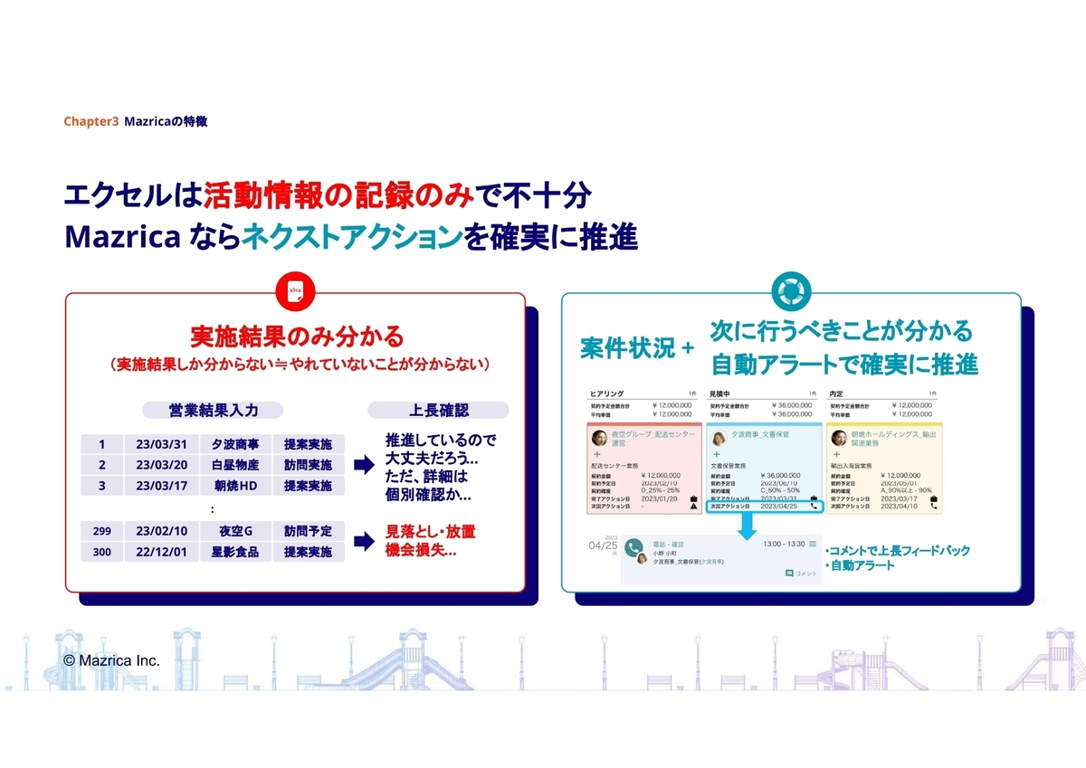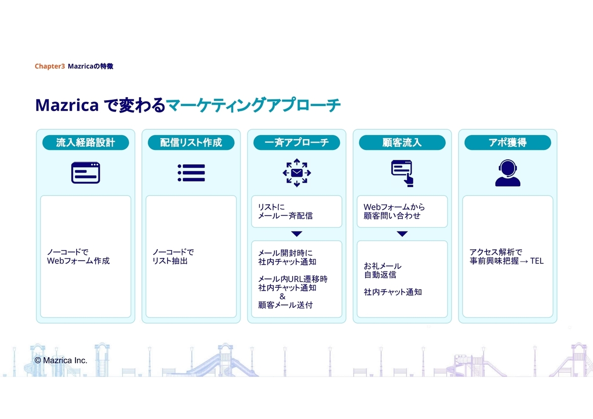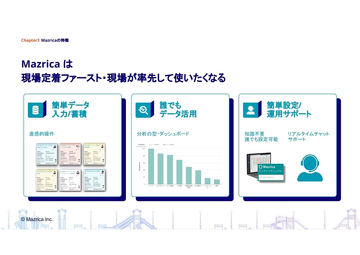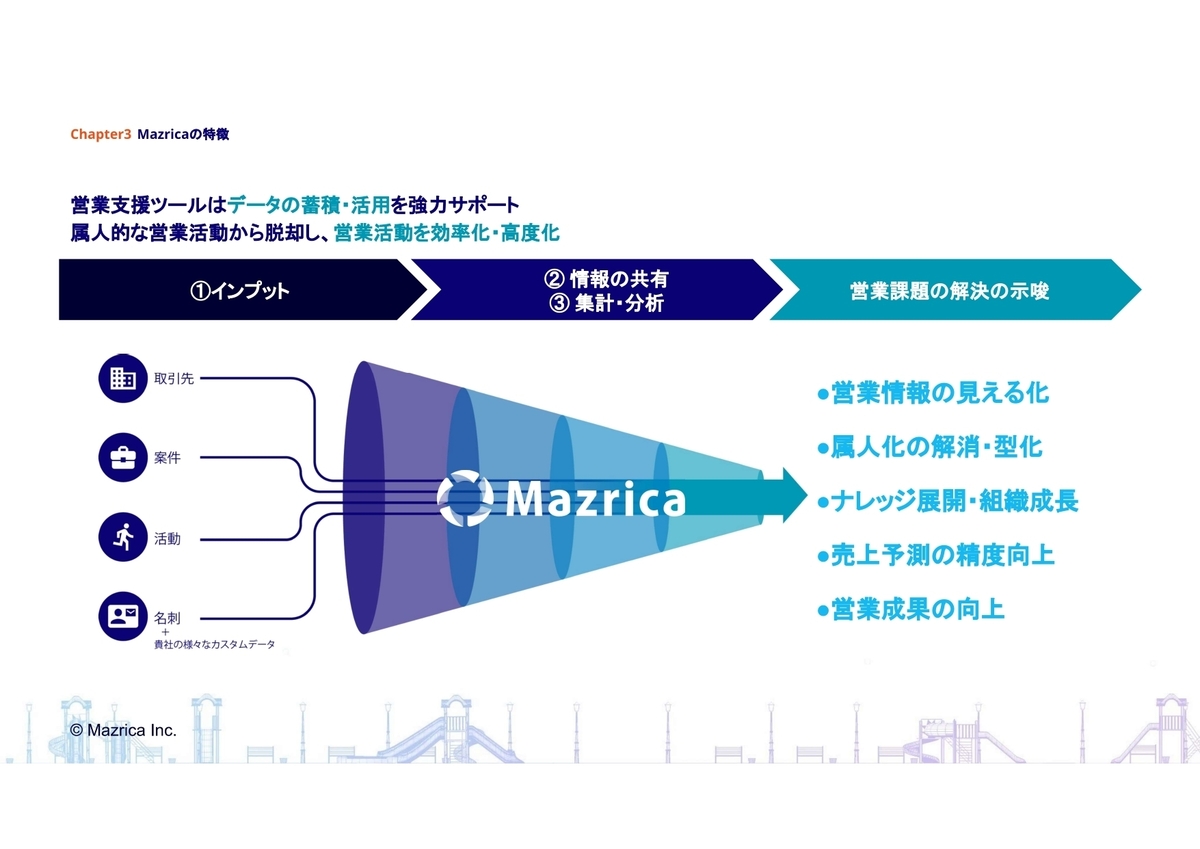 Mazricaを具体的にどう利用していけばよいのか「営業パーソンの過ごし方」「マーケティングアプローチ」「経営管理・営業戦略」それぞれの立場におけるシーン別の操作方法をご案内しています。Mazricaを使うことでなにが可能になり実務がどう変わるのか、こちらの第3編「Mazricaの特徴」をご覧ください。