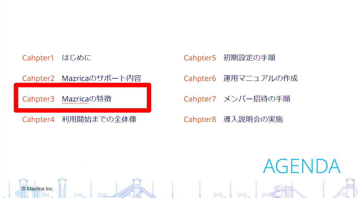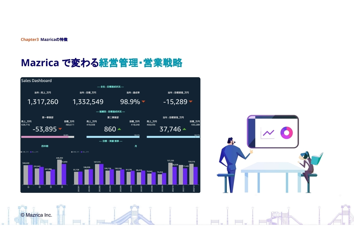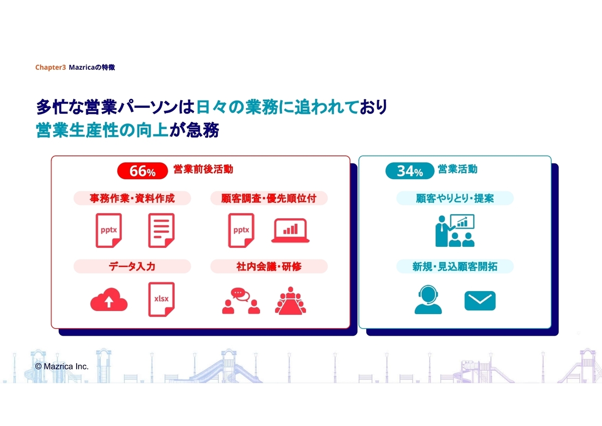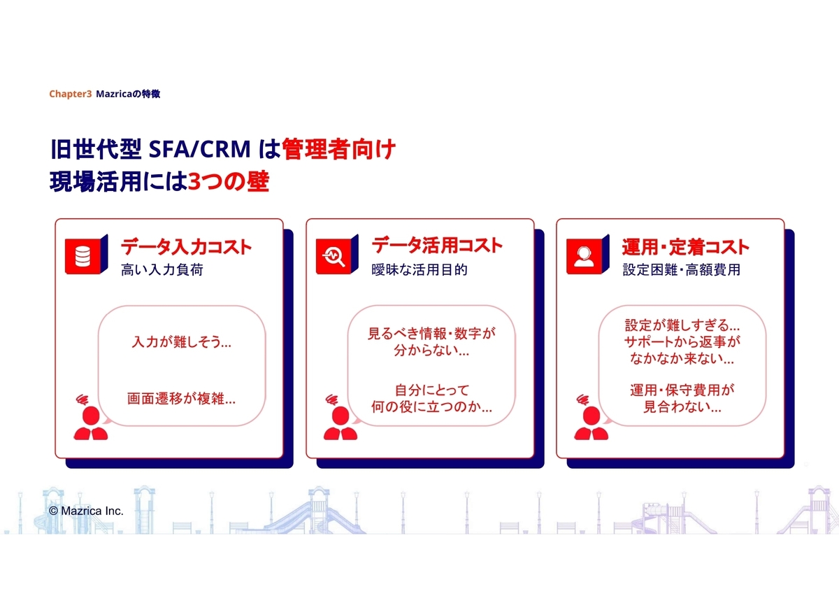 Mazricaを具体的にどう利用していけばよいのか「営業パーソンの過ごし方」「マーケティングアプローチ」「経営管理・営業戦略」それぞれの立場におけるシーン別の操作方法をご案内しています。Mazricaを使うことでなにが可能になり実務がどう変わるのか、こちらの第3編「Mazricaの特徴」をご覧ください。