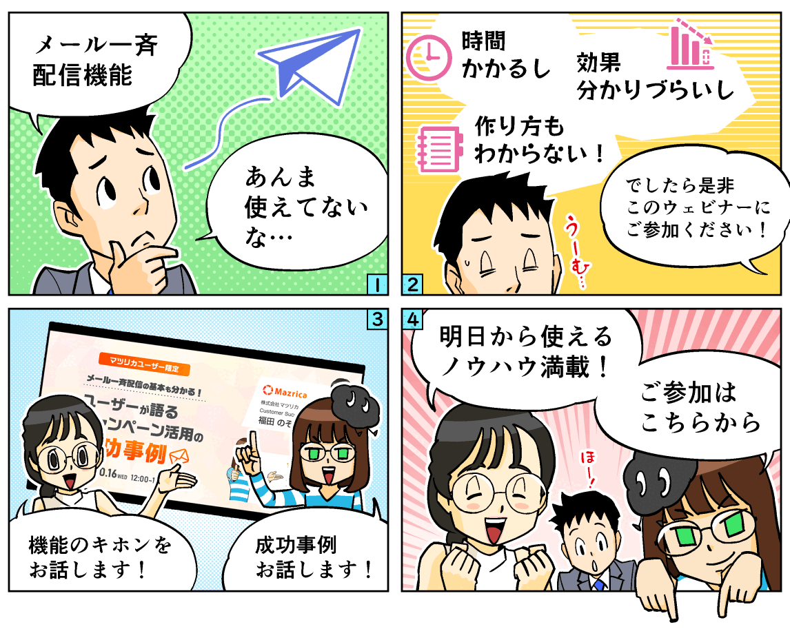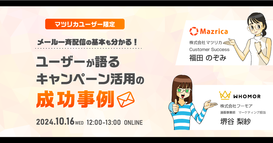 Mazricaメール一斉配信(キャンペーン)機能をご利用中の株式会社フーモア堺谷さんに、どのように実業務で活用しているか、効果的なメールをどのように作成しているか実操作と共にご案内いただくセミナーを開催します。