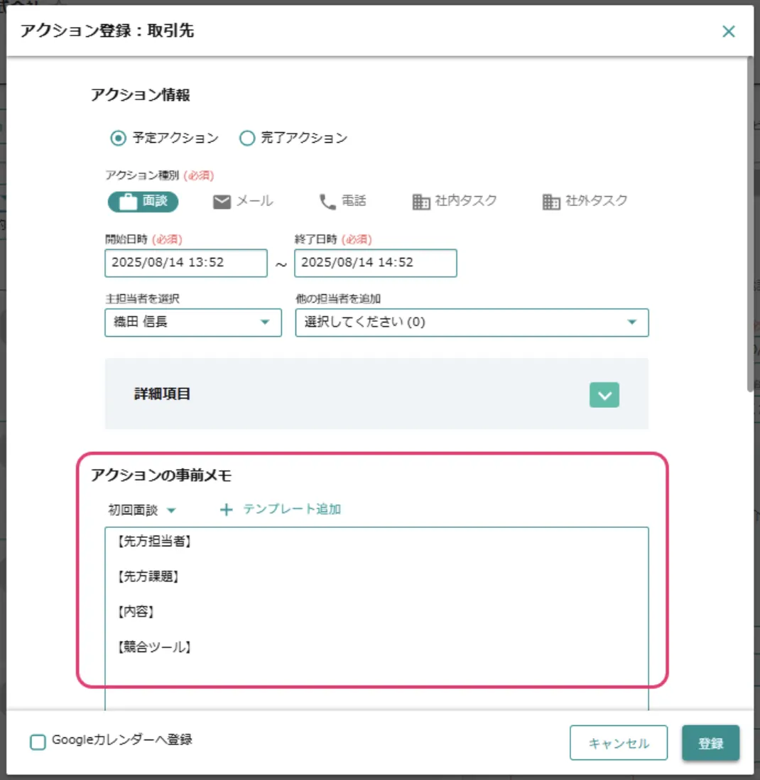 ●アクションの事前メモ欄、実施結果欄それぞれにテキストベースのテンプレートを設定できます