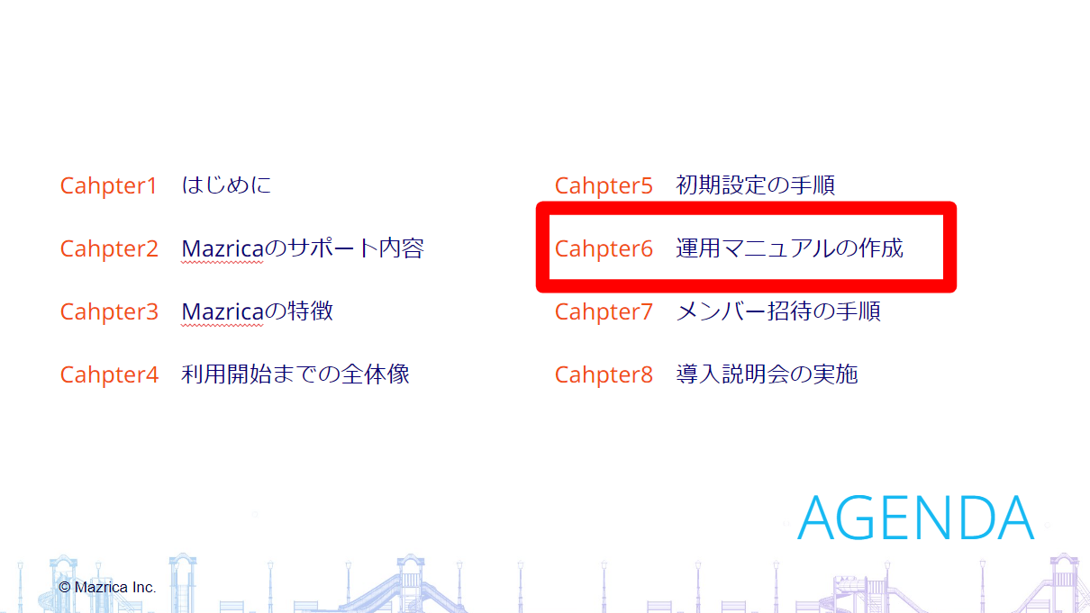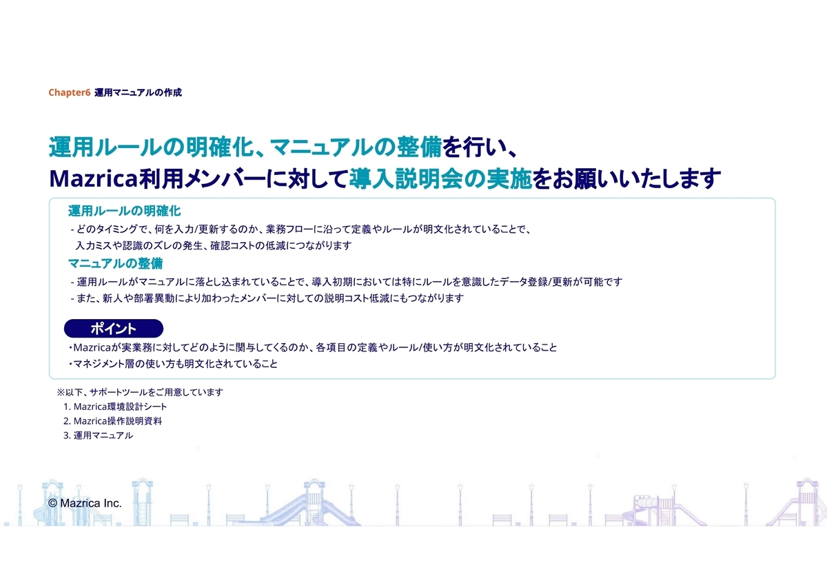 Mazricaをチームメンバー全員で活用するには、自社チーム専用の運用マニュアルの作成が必須です。チームの運営に詳しい人、Mazricaの操作に詳しい人、共に協力して作成にあたりましょう。きちんとした運用マニュアルは、チーム内での認識確認や新人メンバーの参画時に、指針となり大いに役立ちます。こちらの第6編「運用マニュアルの作成」をご覧いただきマニュアルの基礎となる資料を資料ダウンロードしてください。
