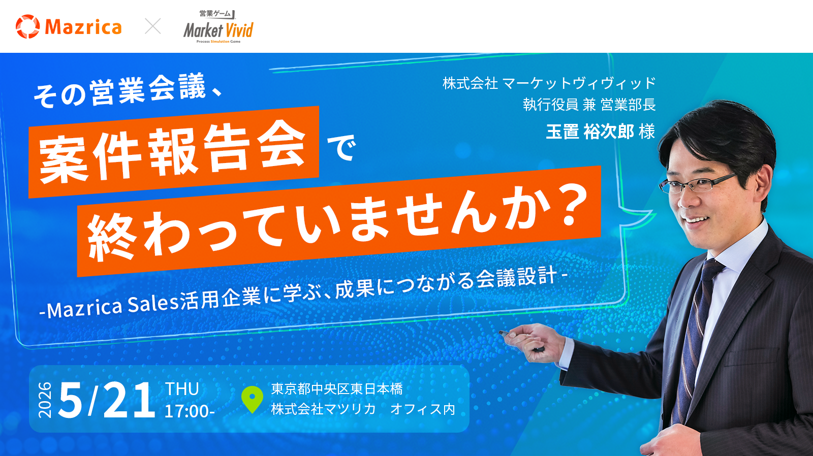 本イベントでは、MazricaSales活用企業であり、営業会議・案件管理を仕組み化する営業組織支援企業株式会社マーケットヴィヴィッド / 執行役員 兼 営業部長 玉置さんに、営業会議にMazricaをどう組み込み、案件管理や行動管理をどう運用しているのかを具体的にご紹介いただきます。