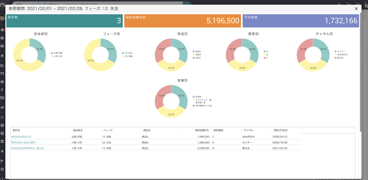チャートの特定期間をクリックしてドリルダウンすると失注案件の詳細が確認できます