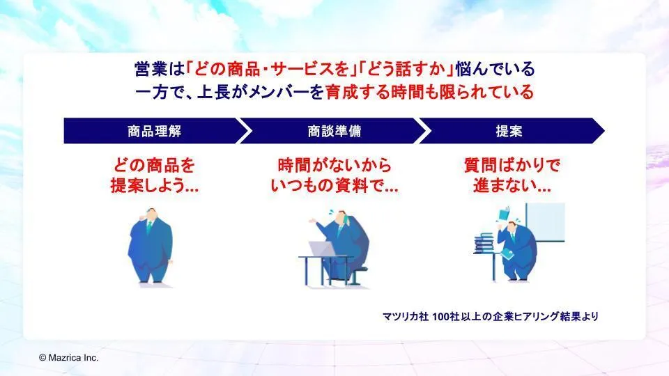 一方、マネージャーは多忙で、メンバー一人ひとりへの十分な育成・サポートの時間を確保できていません。その結果、経験の浅いメンバーは手探りで提案を進めるしかなく、「どの顧客に、何を話すべきか」が不明確なまま、再現性のある成果を出せない状態に陥っています。これらの課題を包括的に解決し、営業組織全体の生産性と提案力を高めるために、本プロダクトを開発しました。
