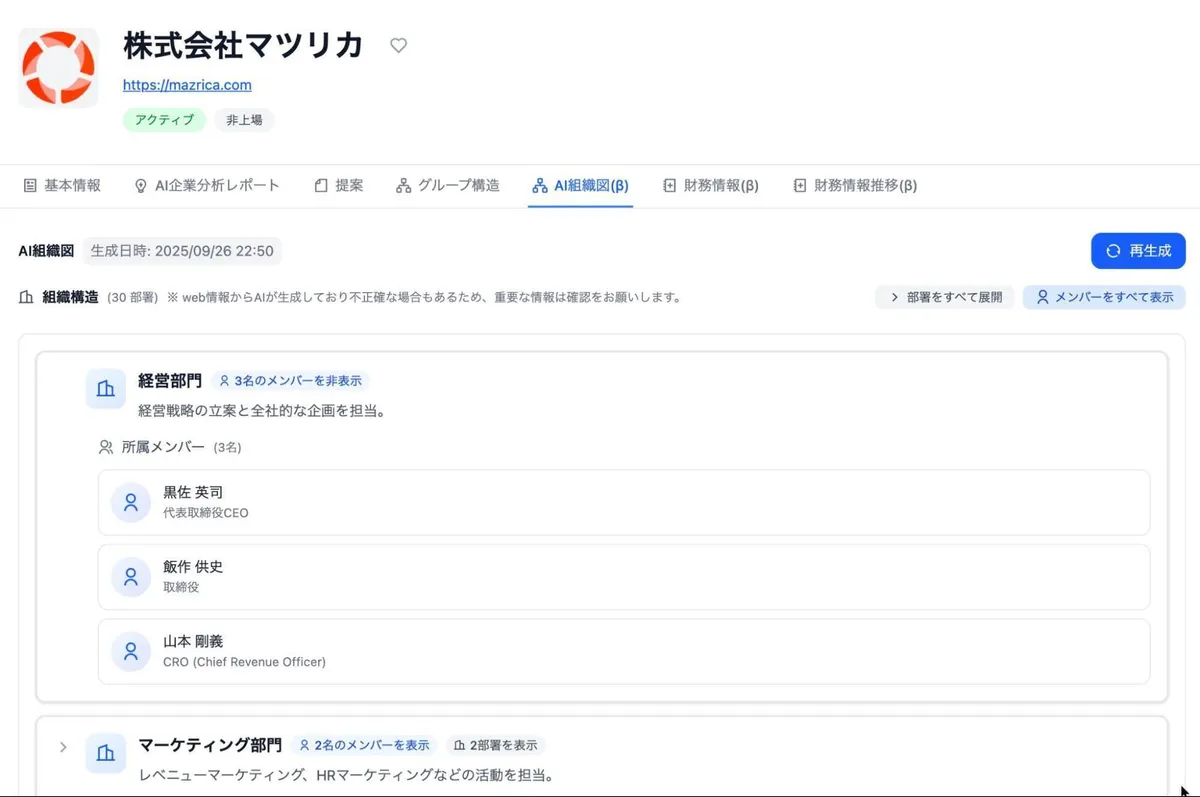 部署ごとの役割やミッション、キーパーソンの経歴・関心領域・メディア露出までを統合し、