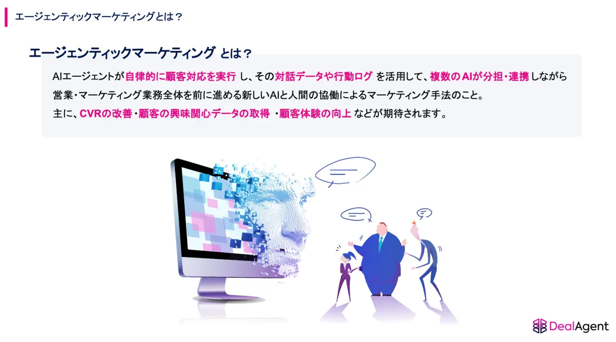 AIエージェントが顧客接点の中心となり、複数のAIが協働しながらビジネスを推進する「エージェンティックマーケティング」の世界は、もはや遠い未来の話ではありません。この大きな変革の波に乗り遅れることなく、今こそ自社のAIエージェント戦略を構築すべき時が来ています。ディールエージェントは「Hana」をはじめとする専門特化型AIエージェントチームを通じて、企業の皆様がこの新たな時代をリードするためのパートナーとなります。