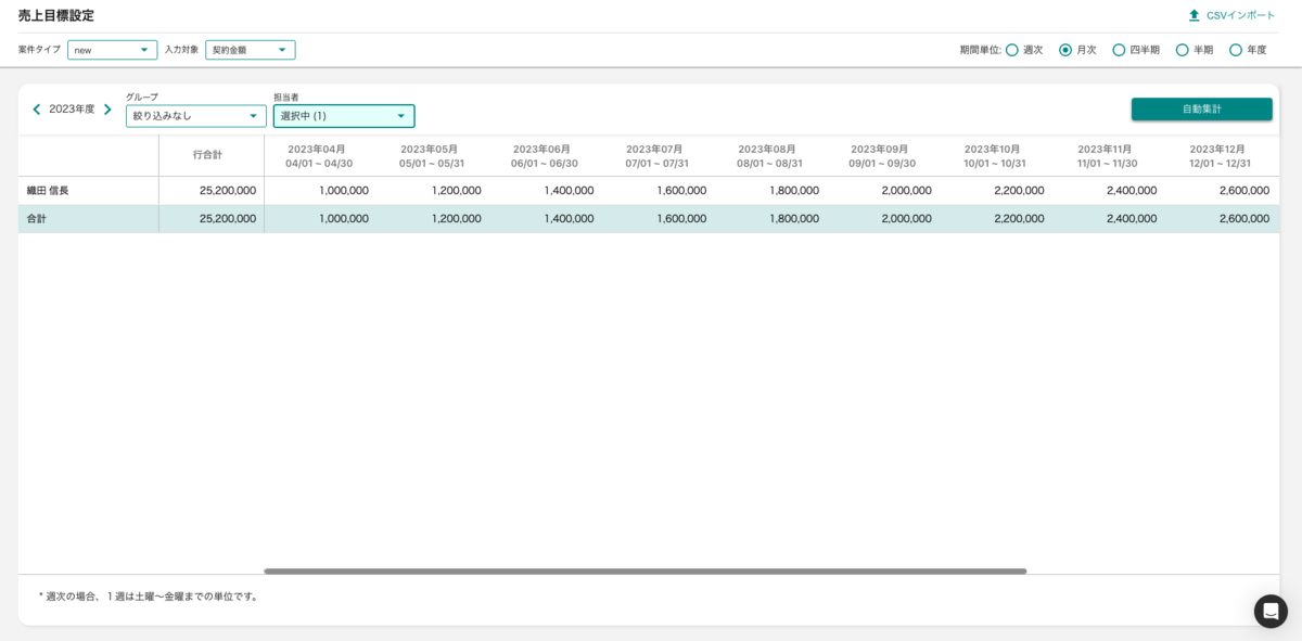 売上目標をCSVでインポートができるようになりました。これにより、目標を入力する作業が効率化されます。