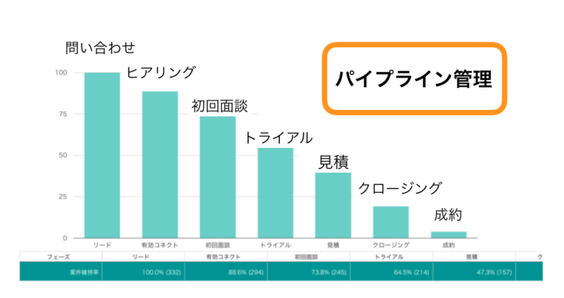 パイプライン管理とは、営業シーンにおいて初回アポから受注までの流れを可視化することで、分析や改善を行っていくマネジメント手法です。