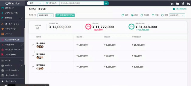 <AIフォーキャスト>これまでMazricaに登録された案件の進捗データを元に、AIを活用した予実管理を行うことで目標に対する実績の差分を明確に確認できるようになりました。個々に設定した営業目標から受注に向けて、AIが幅広くサポートします。優先度の高い案件やリスクを把握することで、効率的な営業活動がを可能にします。メンバー・グループごとに案件をチェックすることも可能です。細かな顧客ケアを積み重ね、受注へ繋げましょう。
