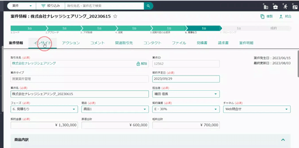<インサイト>Mazrica独自のAIを使った受注予測機能Senses Insightが、「インサイト」として生まれ変わりました。AIが営業目標達成に向けてのギャップや、ネクストアクションを提示し、受注までのリスク詳細や次に取るべきアクションが確認できます。予測されたリスクからネクストアクションを検討することで受注確度を高めることが可能です。画面右上のアクションタイムラインで登録したアクションの成果がきちんと出ているかを繰り返し確認し、効果的な営業サイクルを回しましょう。 受注に向けて懸念されるリスクは「行動リスク」「傾向リスク」の2視点から提示します。
