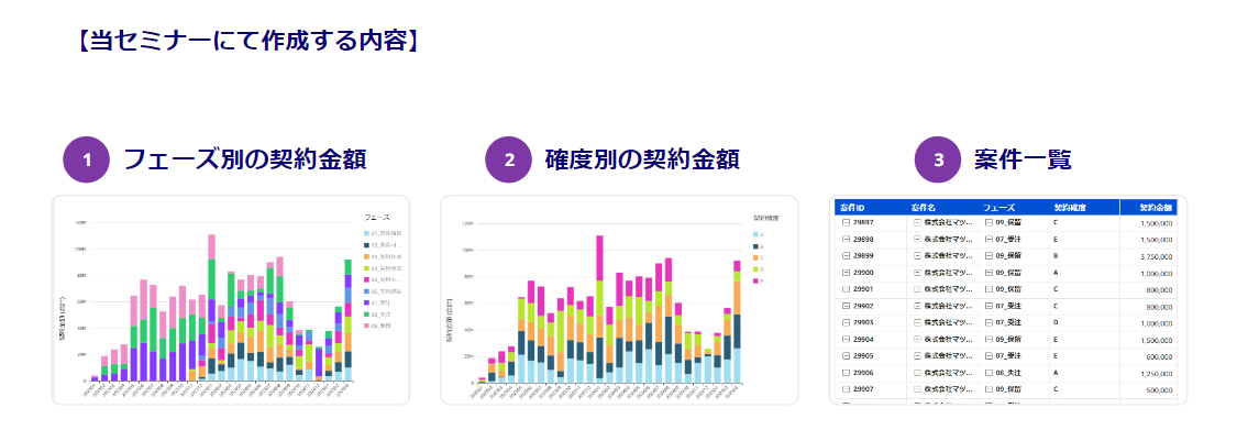 - レポート3種の作成方法(フェーズ別の契約金額、確度別の契約金額、案件一覧)