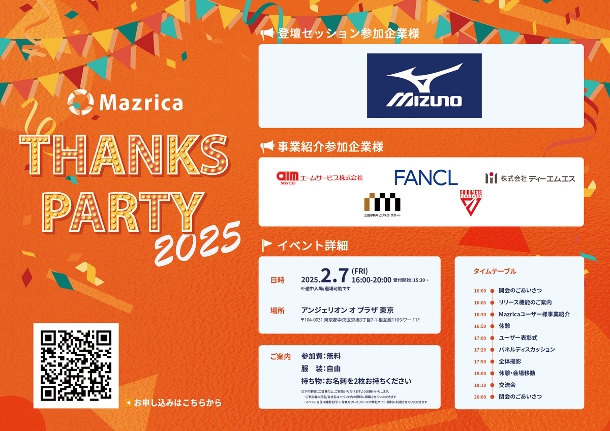 Mazricaの最新機能の活用方法や今後のアップデート情報が知れる、ユーザー同士で交流ができるMazricaThanksPartyを開催します。