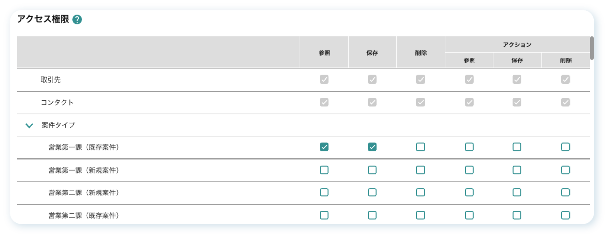 また、今回のアップデートによって「取引先」「案件タイプ」に加え「コンタクト」「アクション」に対しても権限を設定できるようになりました。