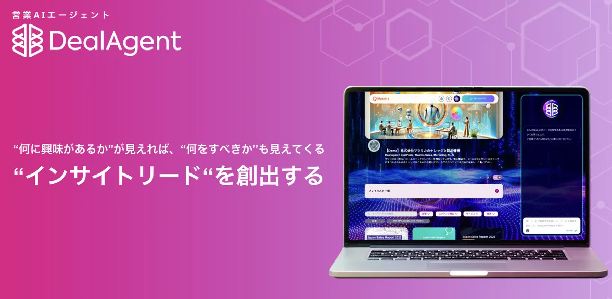 営業AIエージェント「DealAgent」の価格・詳細については下記URLから資料をダウンロード下さい。資料内にAIが搭載されており、実際にご質問やお問い合わせはAIが対応させていただきます。