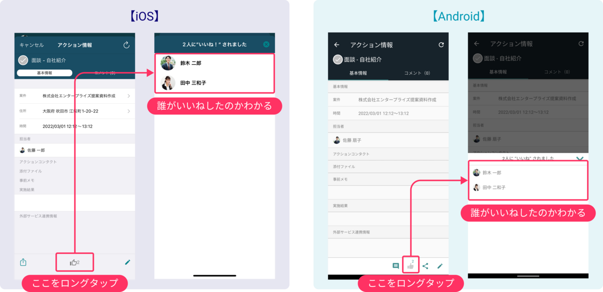 『私の担当アクションにいいねしてくれたの誰だろう?』と思った時は、アクション詳細画面で「いいね」ボタンをロングタップしてみましょう。
