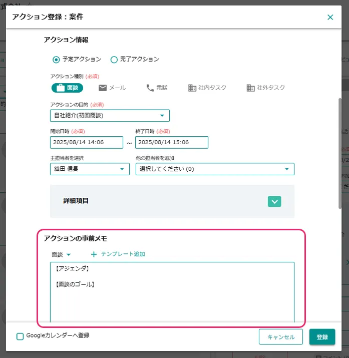 ●アクションの事前メモ欄、実施結果欄それぞれにテキストベースのテンプレートを設定できます
