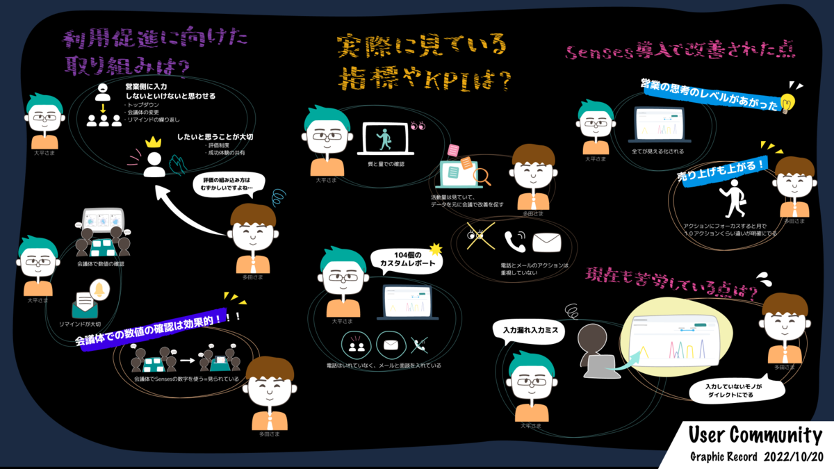 トップ > イベント情報 > 開催済み > Mazricaユーザーコミュニティイベント vol.3 開催報告 退会したユーザー 2023/04/12 21:24 Mazricaユーザーコミュニティイベント vol.3 開催報告 開催日 2022年10月20日 開催方法 オンライン(Zoom) テーマ ユーザーパネルディスカッション イベント内容 1. 利用促進に向けた取り組みは?2. 実際に見ている指標やKPIは?3. Senses導入で改善された点 / 現在も苦労している点は? ご登壇ユーザー オフィスナビ株式会社 大平徳臣さんメディカル・データ・ビジョン株式会社 多田浩幸さん ※当日の様子をまとめたグラフィックレコーディング いいね 共有する 共有する リンクをコピー コメントする 0 件の返信 (新着順)