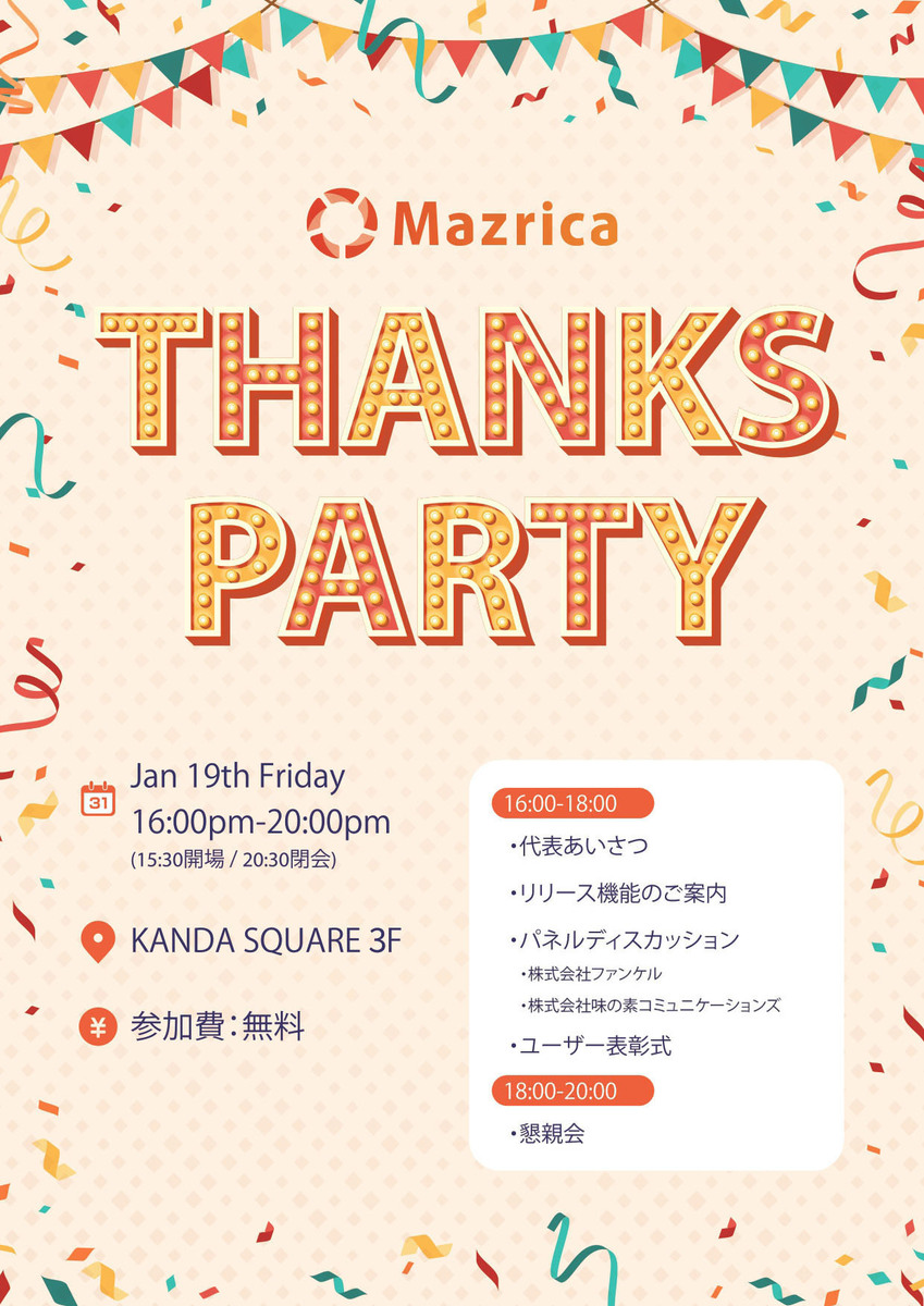 Mazrica Thanks partyでは、たくさんの感謝をお伝えすると共に、さらなるMazricaの活用の一助となるような事例や今後の開発への期待をお持ち帰りいただきます。