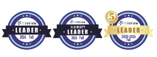 10月に発表された「ITreview Grid Award 2024 Fall」では、ITreviewに集まった約13.1万件のレビューをもとに、顧客満足度と認知度の双方が優れた製品を「Leader」として表彰、バッジが発行されています。ITreviewのLeaderは、多くの利用者から支持を得ている証であり、名誉ある称号です。