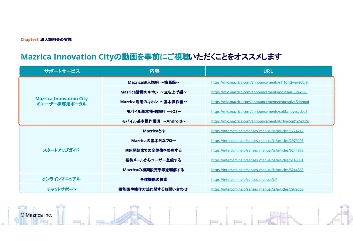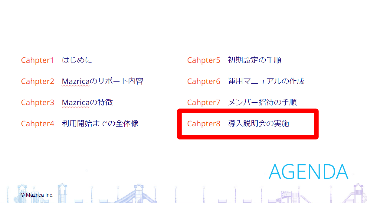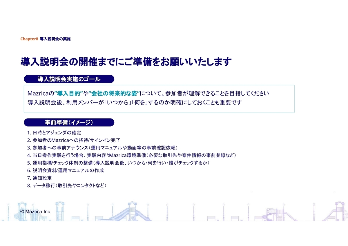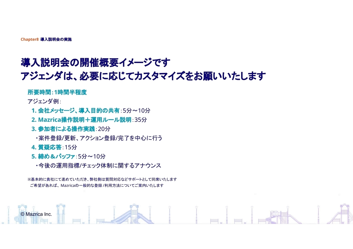 Mazricaをチームメンバー全員で活用を始めるにあたり、導入説明会を実施しましょう。こちらの動画を開催前に各メンバーに視聴してもらうと、導入説明会がよりスムーズに進行できます。詳しくは、こちらの第8編「導入説明会の実施」をご覧ください。