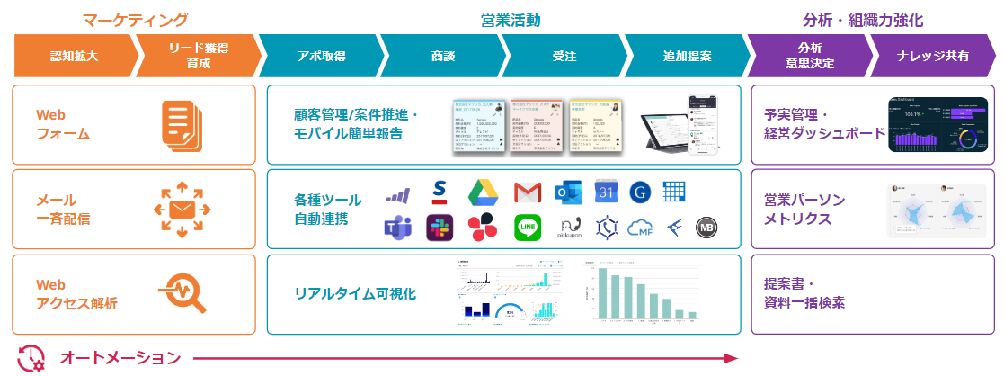 ◆MazricaMarketingとは:webフォーム・webアクセス解析・メール一斉配信・オートメーション機能の総称。数あるサービスの中でも案件成約に特化したマーケティングオートメーションツールです。MazricaSalesとシームレスに連携されており、営業活動を基にしたセグメントへのメール配信の他、見込顧客の自動登録(名寄せ含)やWeb行動把握が自動化され、営業効率化と売上・集客UPを実現します。
