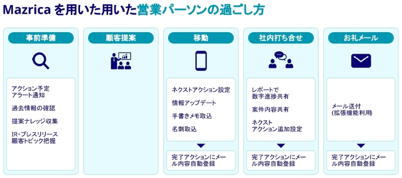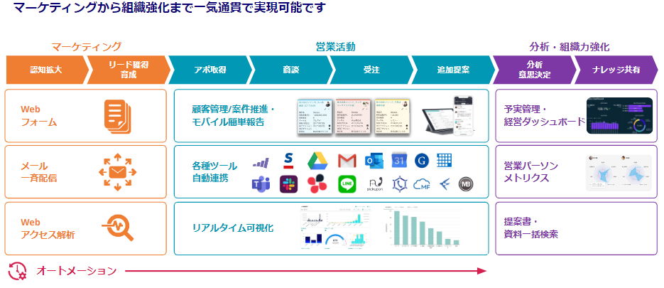 - マーケティング部、企画営業部、営業部、総務部など各部署での業務内容における連携活用