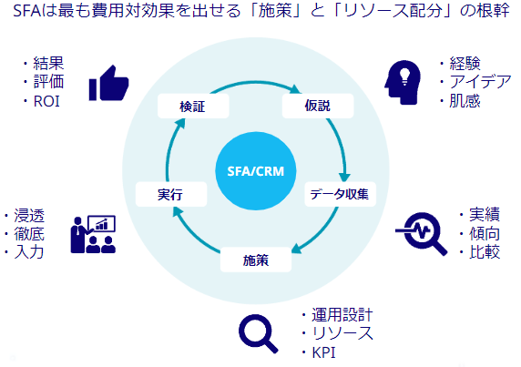 営業とマーケティングやその他の部署間で分断してしまっていたデータを連携させ、誰が・いつ・どの様な経路で流入し、検討、受注・失注しているのかを理解し、適切なアプローチや商談、会計活動につなげましょう。