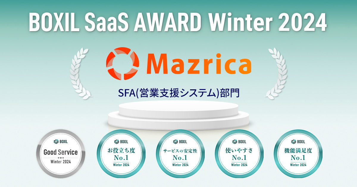 スマートキャンプ株式会社(以下「スマートキャンプ」)が主催する「BOXIL SaaS AWARD Winter 2024」のSFA(営業支援システム)部門で「Good Service」をはじめ、「お役立ち度No.1」「サービスの安定性No.1」「使いやすさNo.1」「機能満足度No.1」の5つの賞に選出されました。