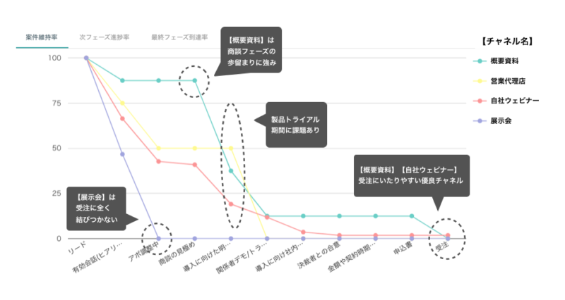 商談のプロセス管理:SFAやCRMツールを活用して商談のプロセスを管理し、受注確度の高い顧客に絞って商談を行うことで、効率的に成果を上げることができます。また、ファネル分析や行動管理を通じて、商談の効果的な進め方やフォローアップを行います。