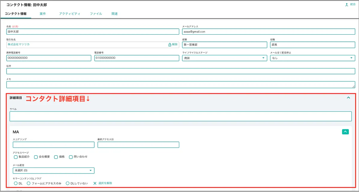 コンタクトにおける詳細項目(自社独自の管理項目)を設定することができます